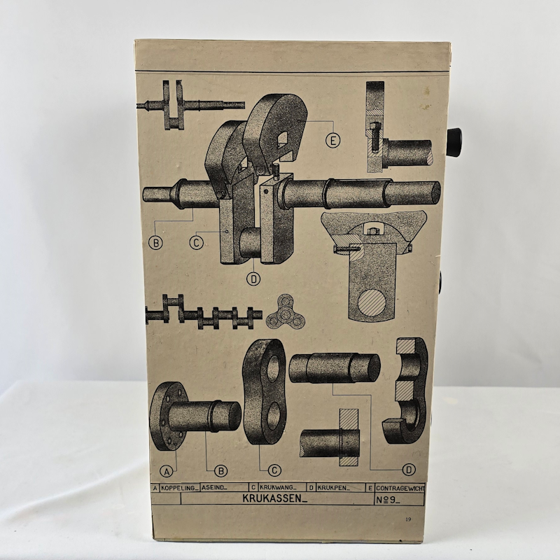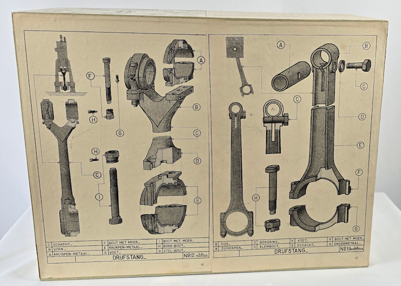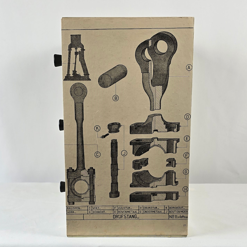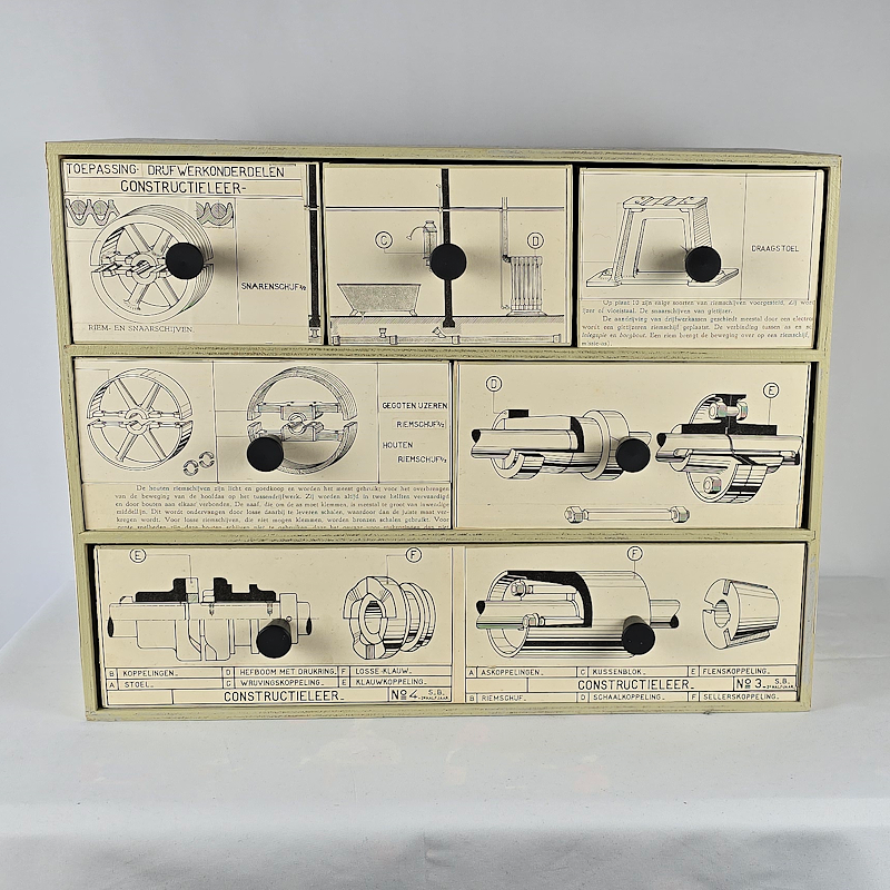 UNIKAT! Die Minikommode mit sechs Schubladen und schwarzen Metallknöpfen ist gestaltet mit Seiten aus einem Übungsbuch für Metallbauer.