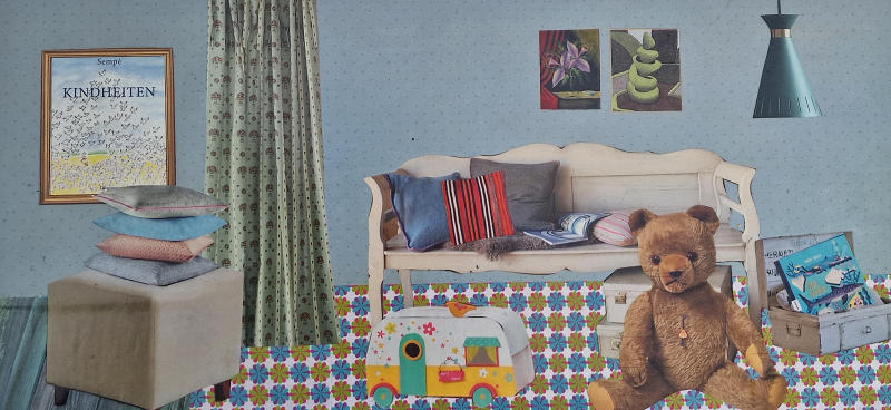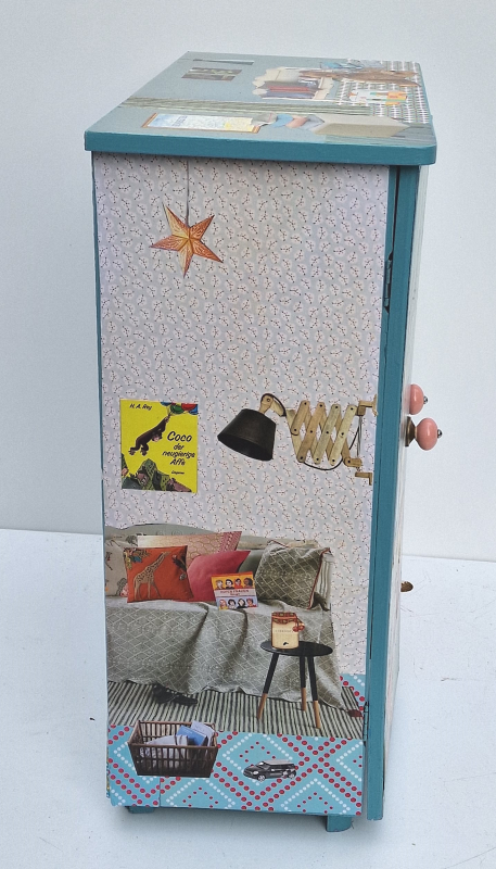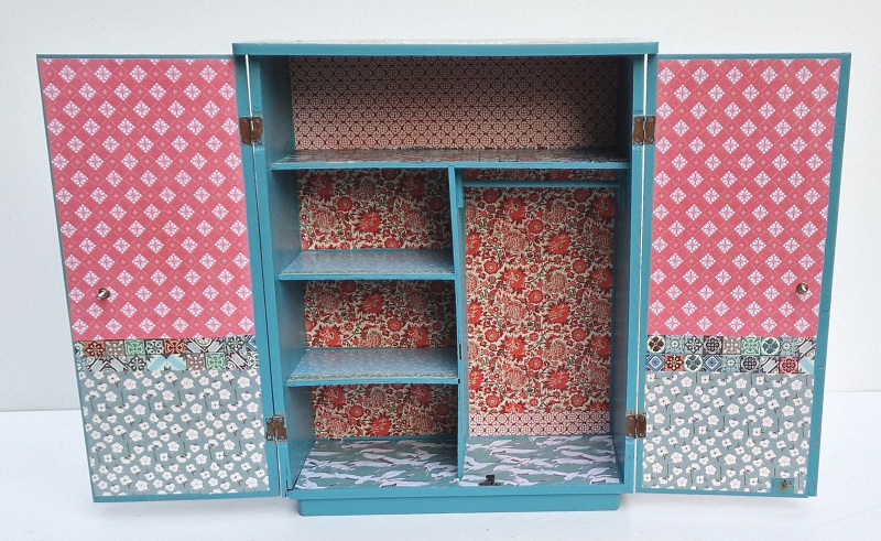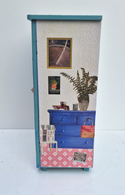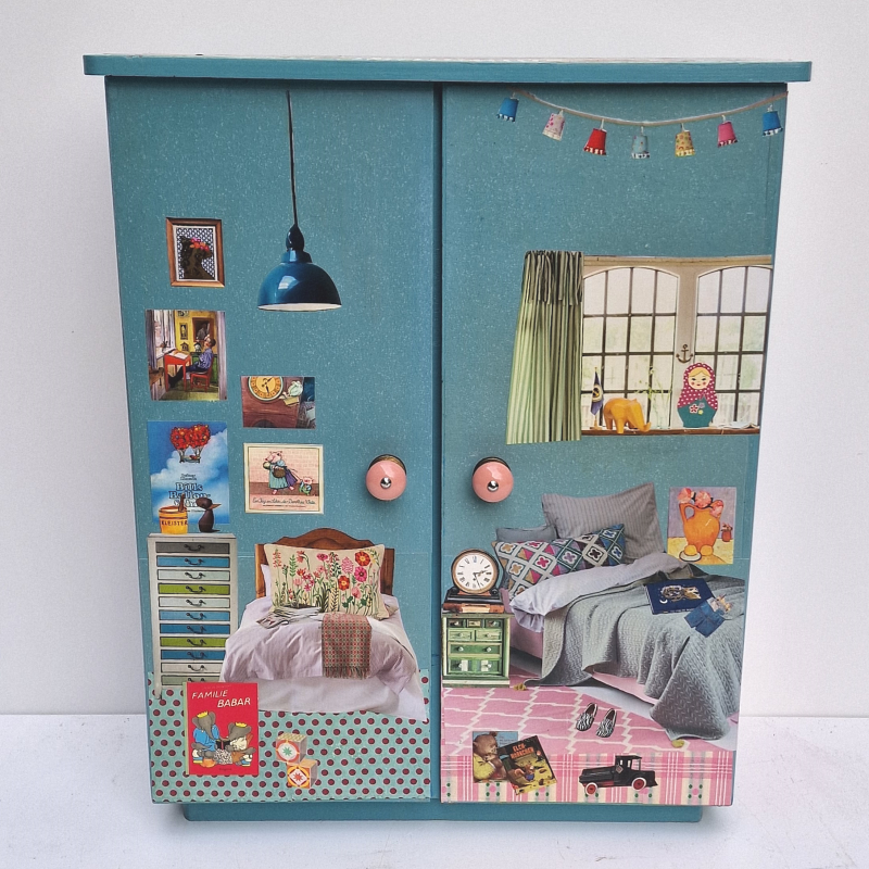 UNIKAT! Großer Puppenschrank mit zwei Türen und Porzellangriffen. Innen gibt es drei Regalbretter und eine Kleiderstange zum Verstauen der Puppenkleidung. Der Schrank ist aufwändig gestaltet mit Musterpapieren in Blau und Rosa und hat eine Bildgestaltung auf Türen, Seitenflächen und Deckplatte. Man blickt in Kinderzimmer mit Möbeln, Bildern und Spielzeug. VERSAND MÖGLICH.