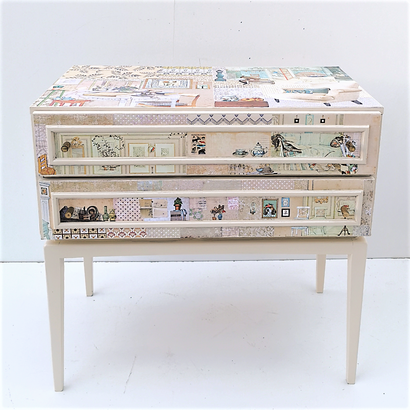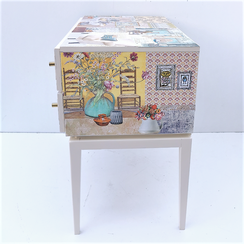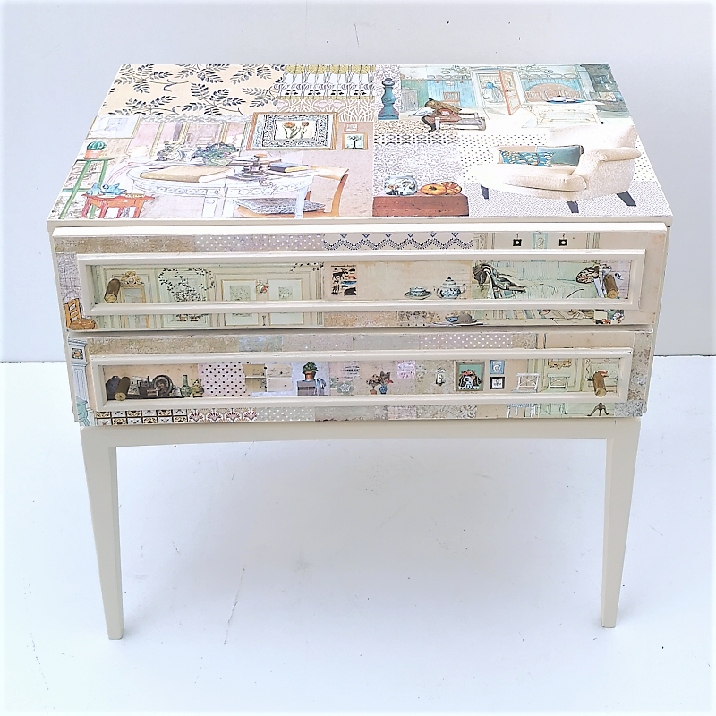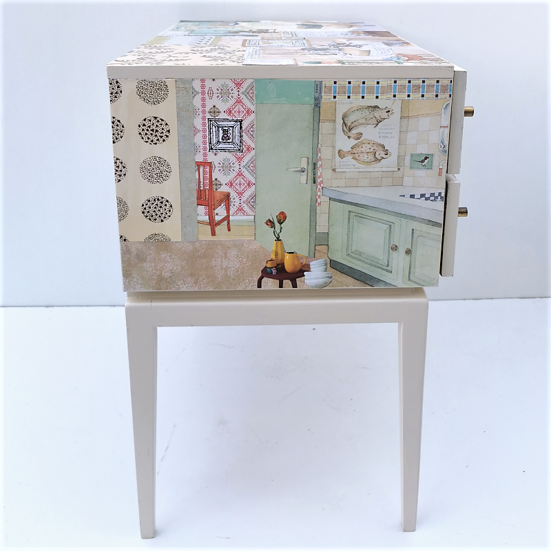 UNIKAT! Niedriger Nachtschrank auf hohen Beinen mit zwei Schubladen und Originalknöpfen. Hier werden Musterpapiere mit Ausschnitten aus Kinderbüchern und Innenräumen von Gustav Larsson kombiniert. Einblicke in Zimmer und Einrichtungsgegenstände der Kindheit, an die man sich erinnert, spielen die Hauptrolle. VERSAND MÖGLICH.
