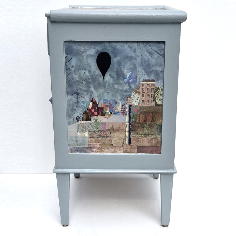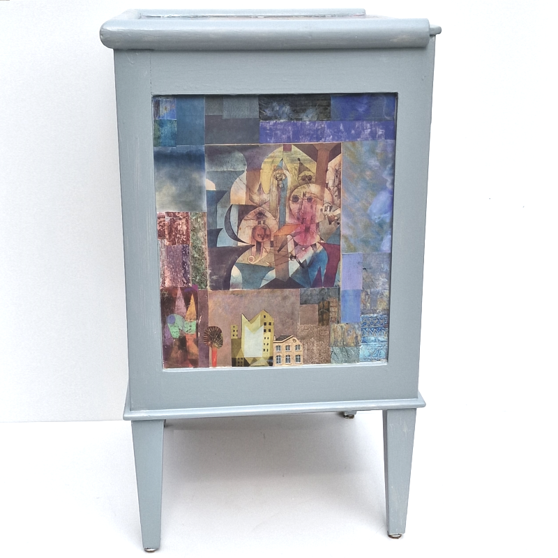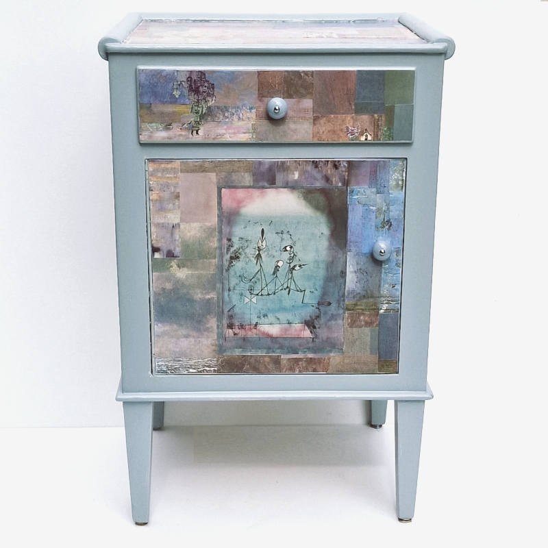 UNIKAT! Hochbeinige Kommode mit einer Schublade, einer Tür und Porzellangriffen. Die Gestaltung besteht aus der aufwändigen Collage aus farbigen Rechtecken in Lilatönen und Ausschnitten aus Gemälden von Paul Klee. Auf der Tür ist seine "Zwitschermaschine" von lila Rechtecken gerahmt. VERSAND MÖGLICH.